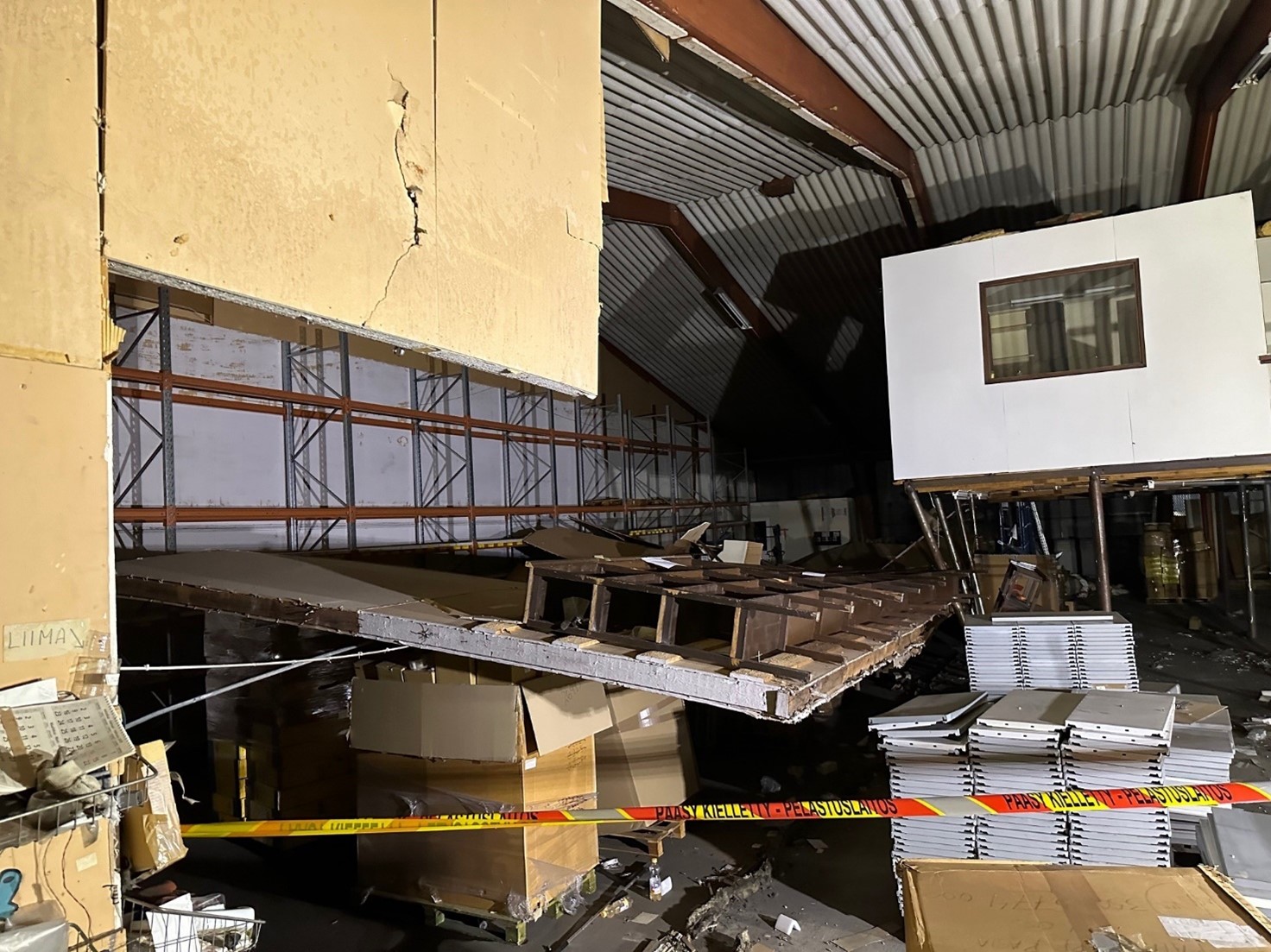 Kaatunut seinä oli toiminut sekä hallia jakavana väliseinänä että samalla toisen kerroksen toimistotilan päätyseinänä.