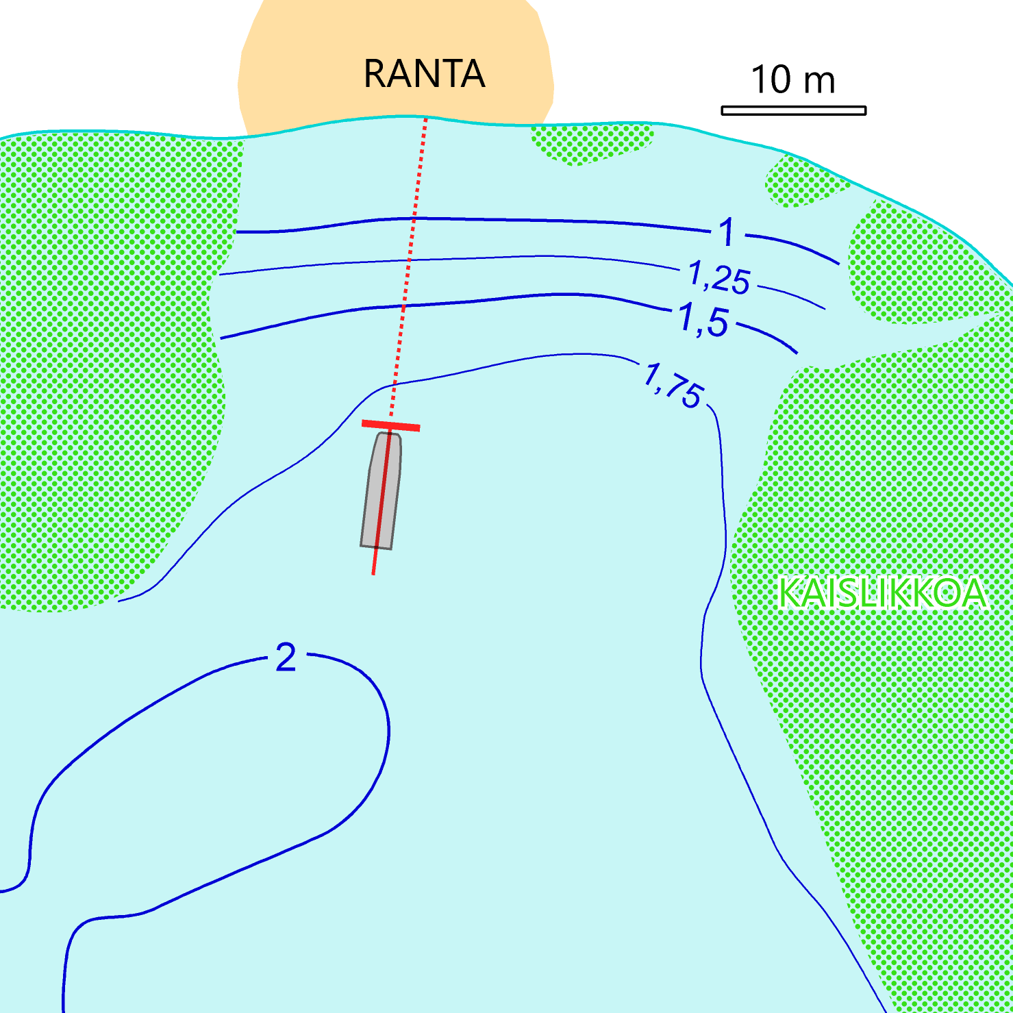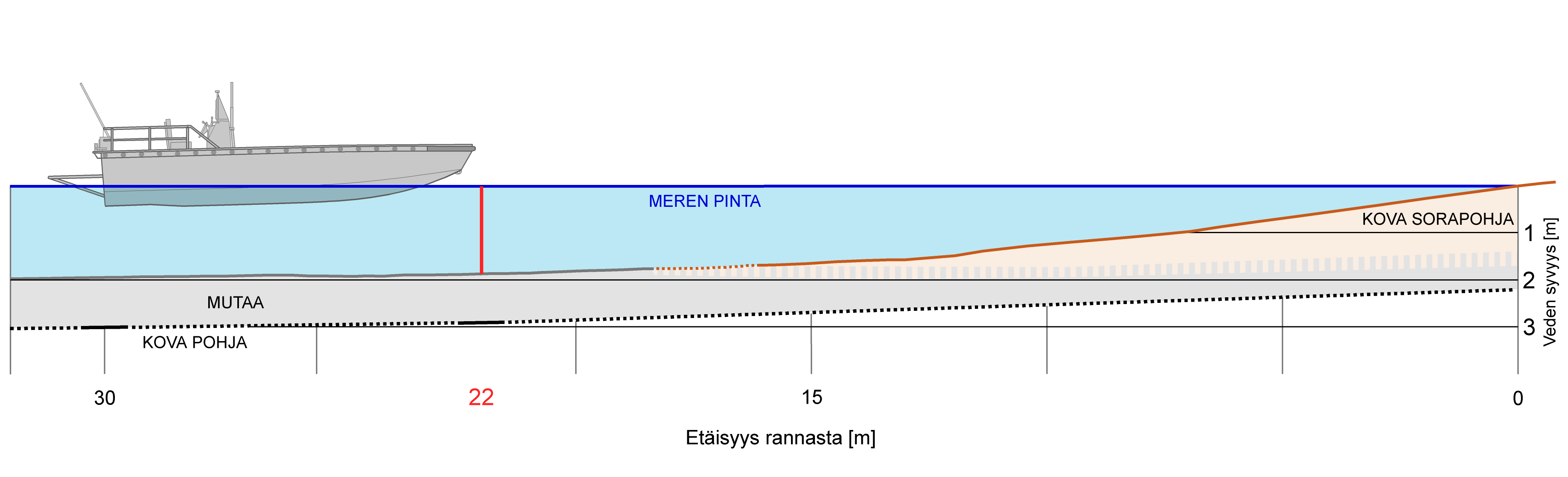 ”Rannan tuntumassa pohja on kulkukelpoista soraa, noin reilun viidentoista metrin päässä pohja muuttuu upottavaksi mudaksi ja vesi on liian syvää tämänkaltaiseen veneestä poistumiseen”, toteaa tutkinnanjohtaja Kai Valonen.